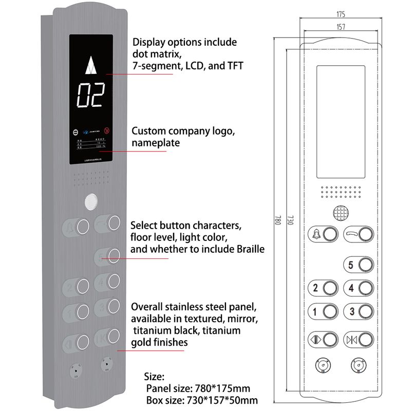Bedieningspaneel met behuizing: Door de behuizing is de totale dikte relatief dik, waardoor deze een bepaalde afstand uit de wand van de cabine kan steken. De uiterlijkstijl is vrij traditioneel, maar door verschillende paneelmaterialen (zoals roestvrij staal, glas, enz.) en oppervlaktebehandelingstechnieken te kiezen, kan het ook verschillende visuele effecten presenteren.
